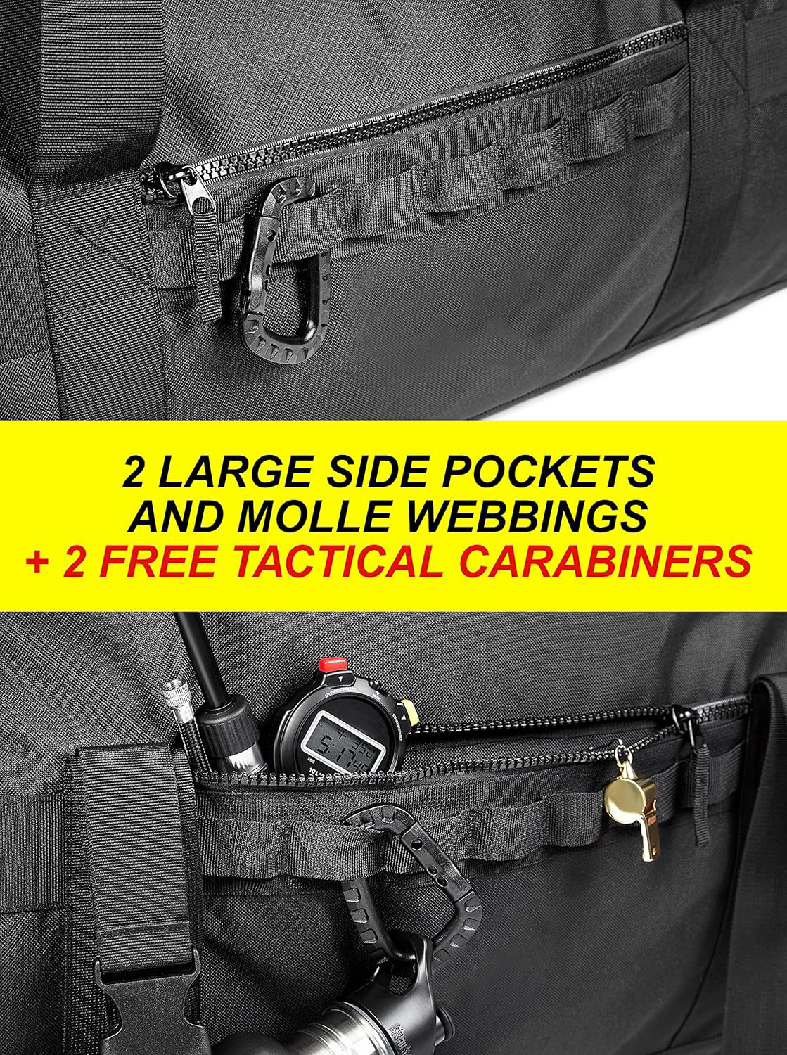 - FIELD TESTED FOR THE OUTGOING ATHLETES – We are passionate about our products and designed our duffel bags based on real-life encounters. Molle webbing is added to secure keys, water bottles and other accessories when you are out and about. 4 ventilation holes can reduce unpleasant odors when carrying wet cloths or other items. 2 extra tactical carabiners are also included for your convenience. We are proud to say that our long duffel bag is more than just a bag, it is also your companion in outdoor activities.