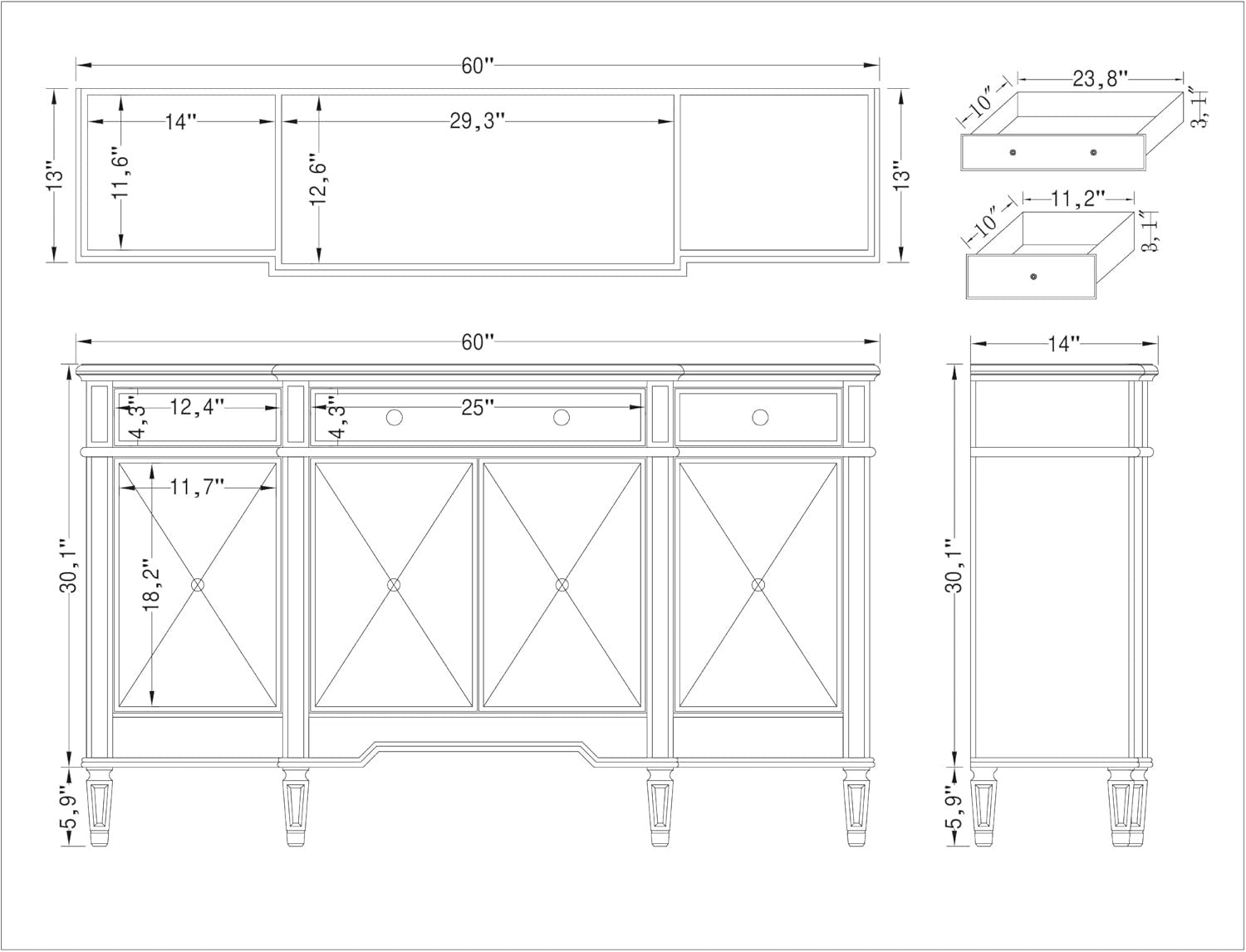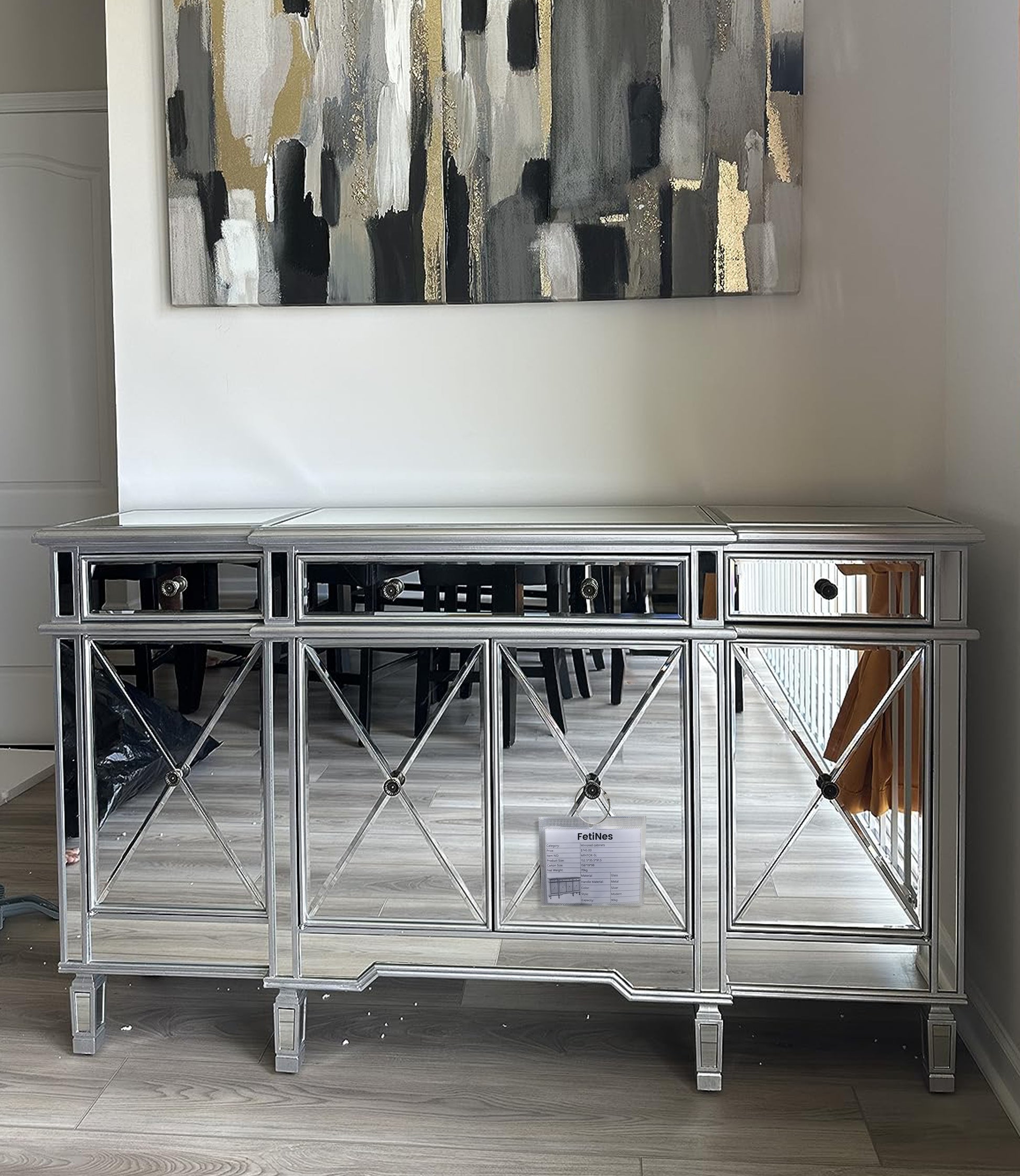 FetiNes 60" Silver Wood Frame Mirrored Storage Sideboard Buffet Cabinet