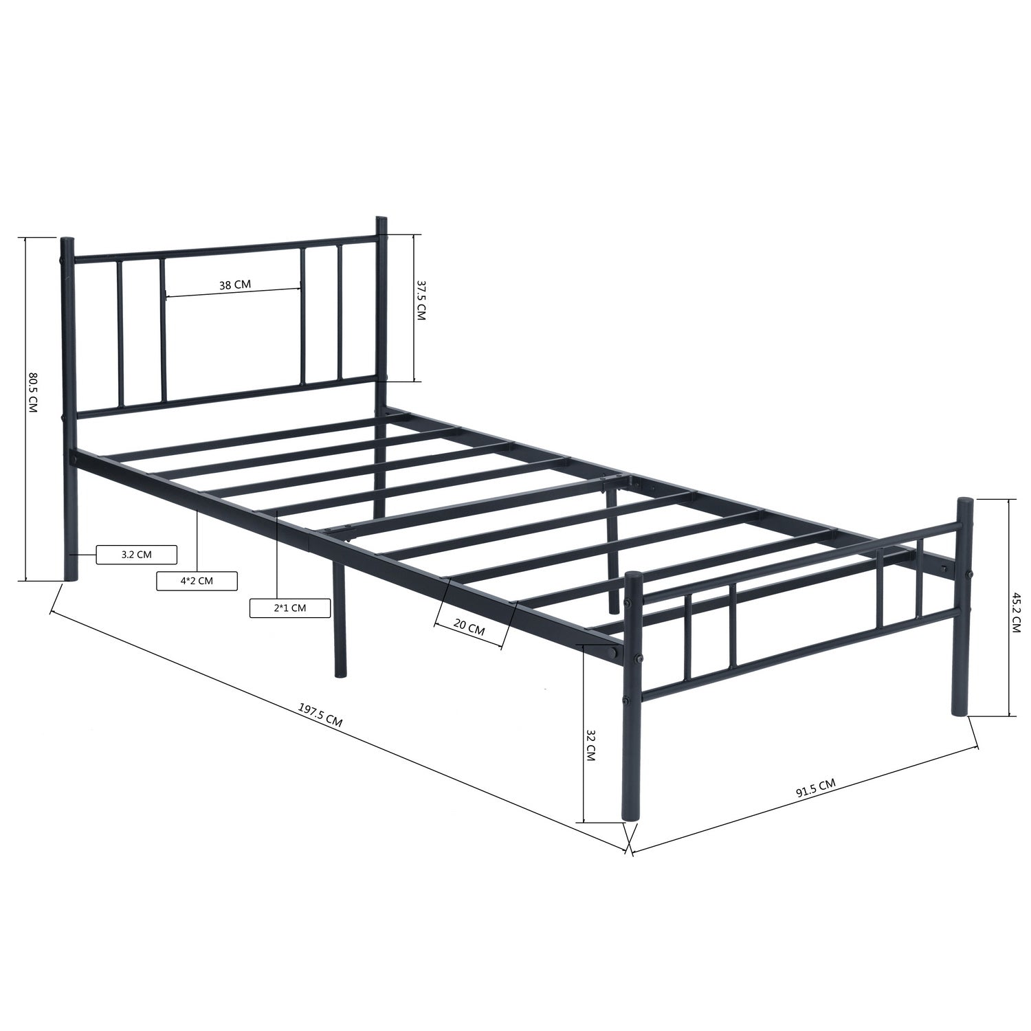 - Twin Size Metal Bed Frame: Overall Size: 37.48’’ (W) x 77.32’’ (L) x 35.24’’ (H). 12.79"-off-the-floor leaves you a spacious space to store your luggage, containers and other items, which helps keep your room tidy and clean.