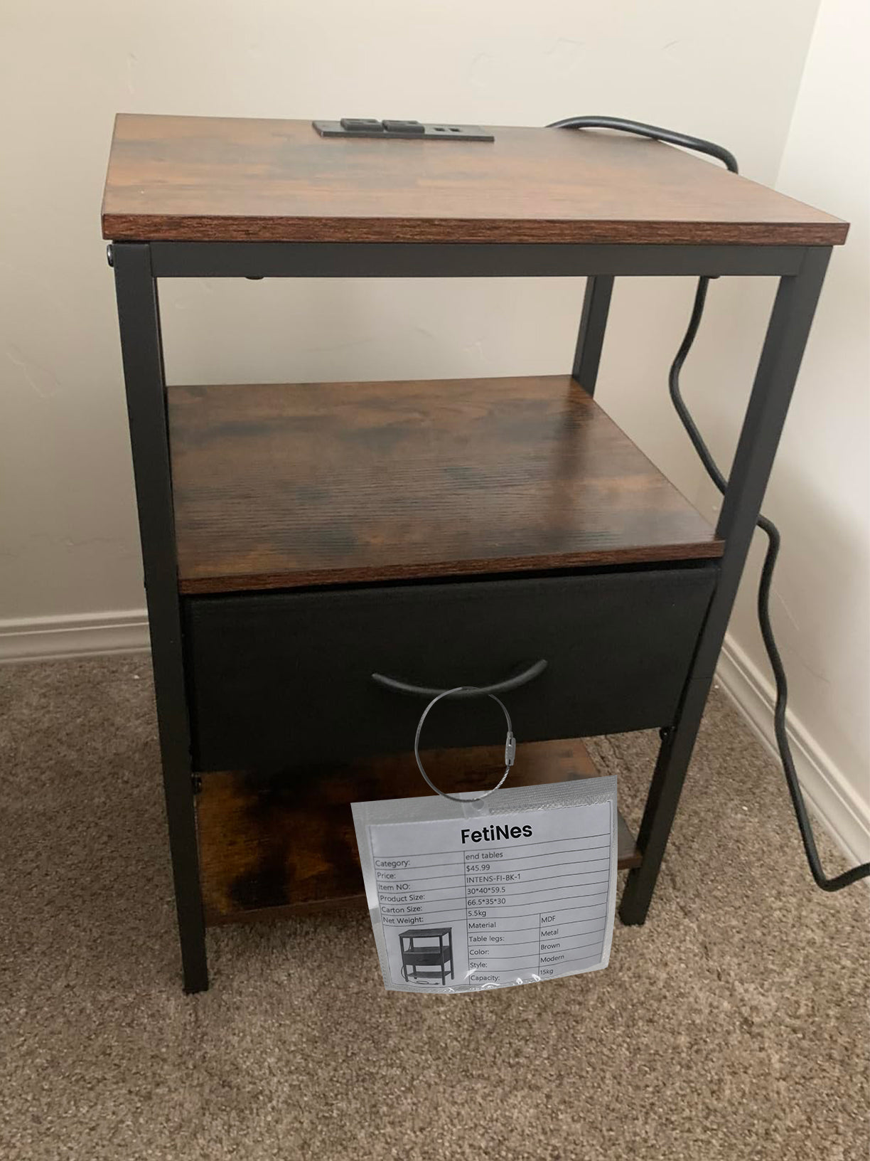 - Night Stand with Charger Station-1 USB port, 2 outlets and 1 Type-C port are on the nightstand for bedrooms. Imagine plugging in your lamp, phone or watch before sleep, power is just within your reach, then be happy to greet the morning with fully charged devices. Plus: Contain patent pending drawer slide